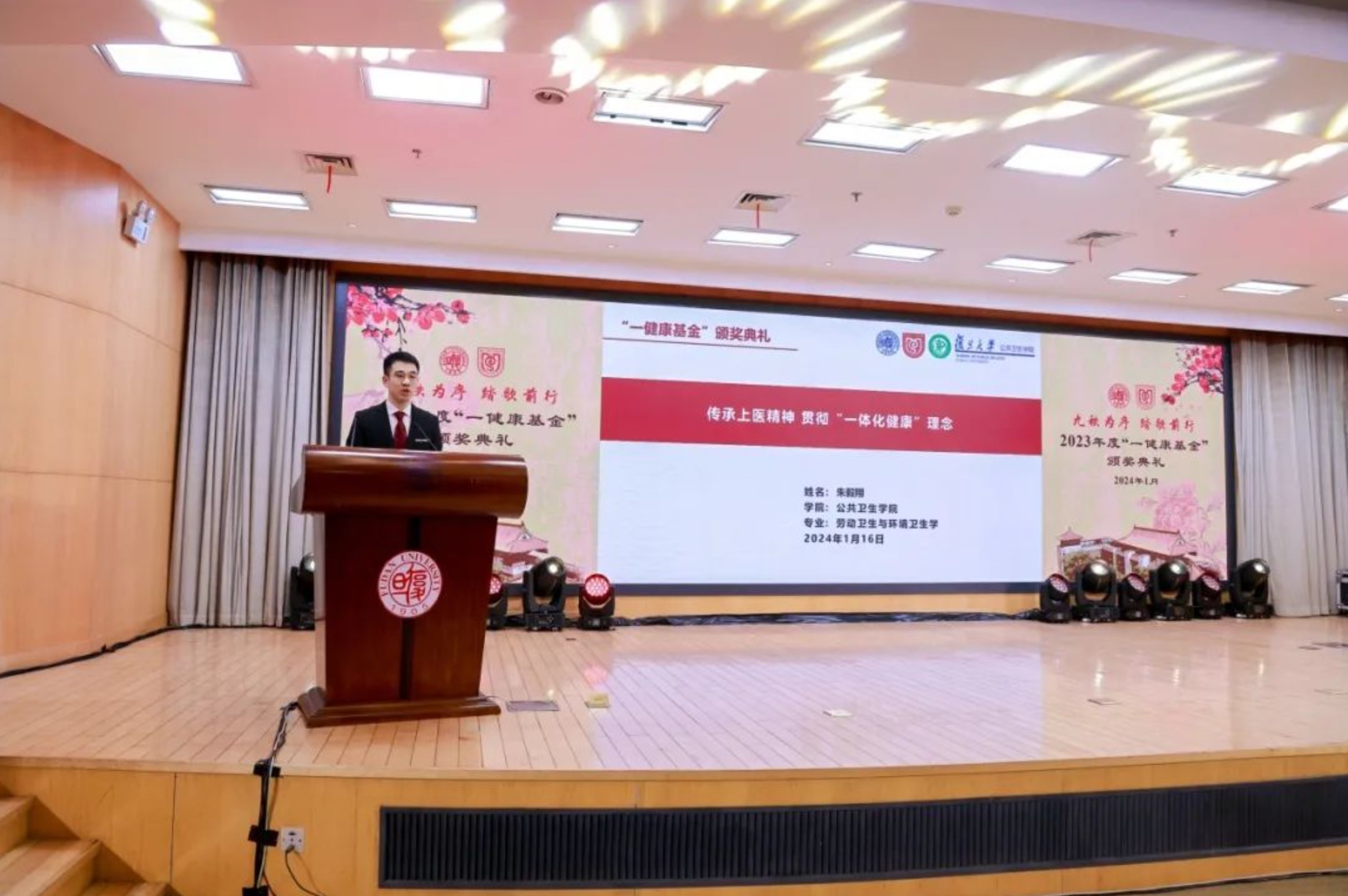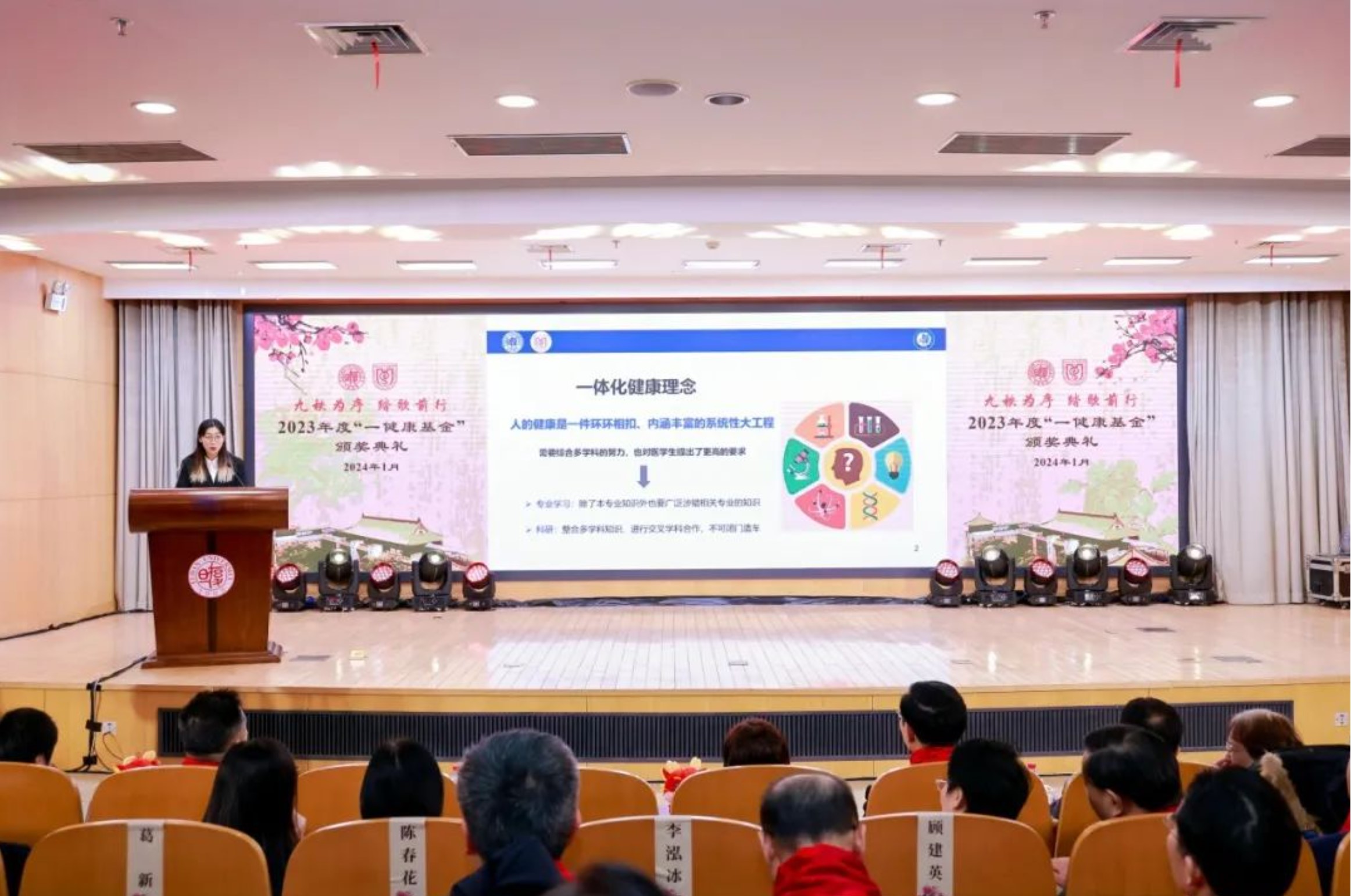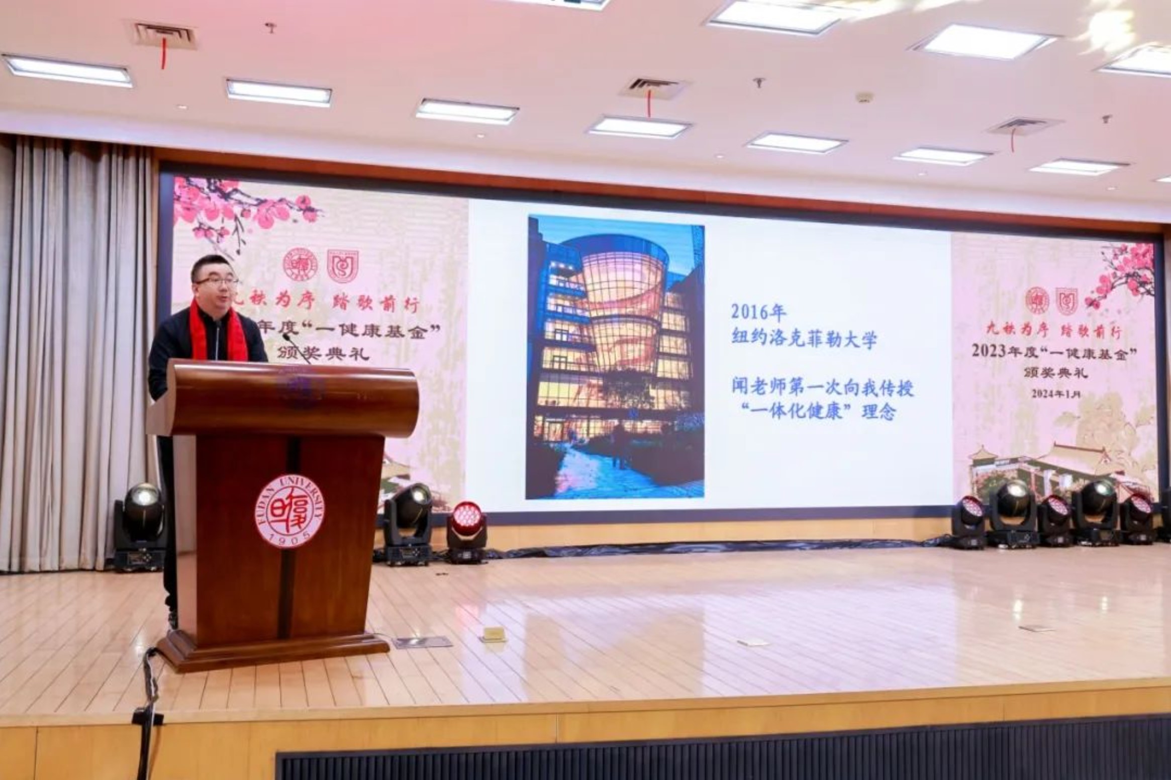 1月16日,2023年度“一健康基金”颁奖仪式在复旦大学上海医学院明道楼一楼报告厅举行。当天恰逢“一健康基金”创始人、中国工程院院士闻玉梅90岁生日,在场师生同道共同见证这一温馨而意义非凡的时刻。“一健康基金”由闻玉梅院士、宁寿葆教授夫妇于2013年1月16日发起成立。十余年来,基金倡导的“一体化健康”理念逐渐深入人心。