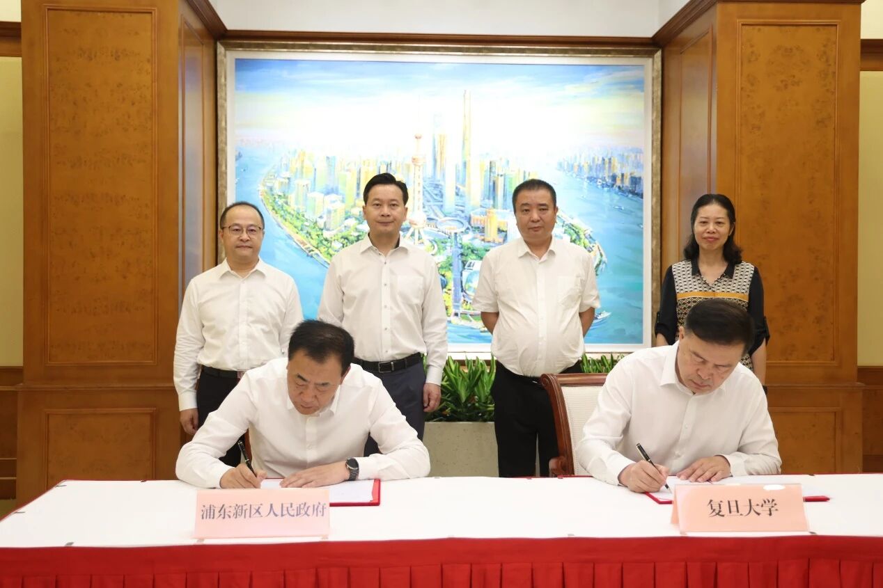 在中国科学院院士、复旦大学校长、上海医学院院长金力,上海市政府副秘书长、浦东新区区委副书记、区长吴金城,复旦大学党委常委、常务副校长许征,浦东新区区委副书记单少军的见证下,浦东新区副区长吕雪城与复旦大学上海医学院党委副书记杨伟国代表双方签署协议。