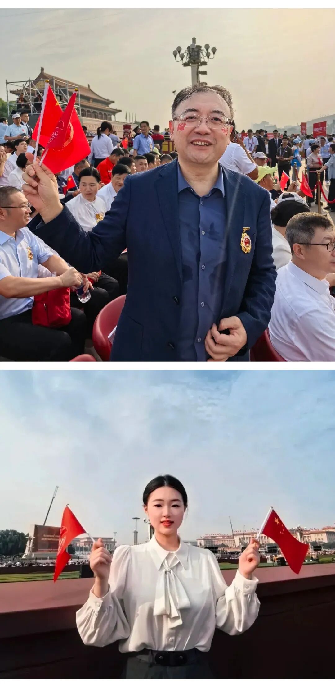 中国科学院院士、复旦大学校长、上海医学院院长金力,2025年“全国先进工作者”称号获得者、中山医院内镜中心主任周平红在天安门广场现场观礼。