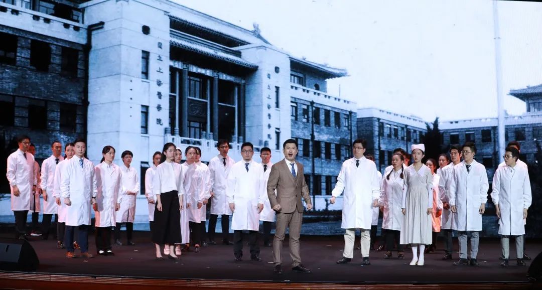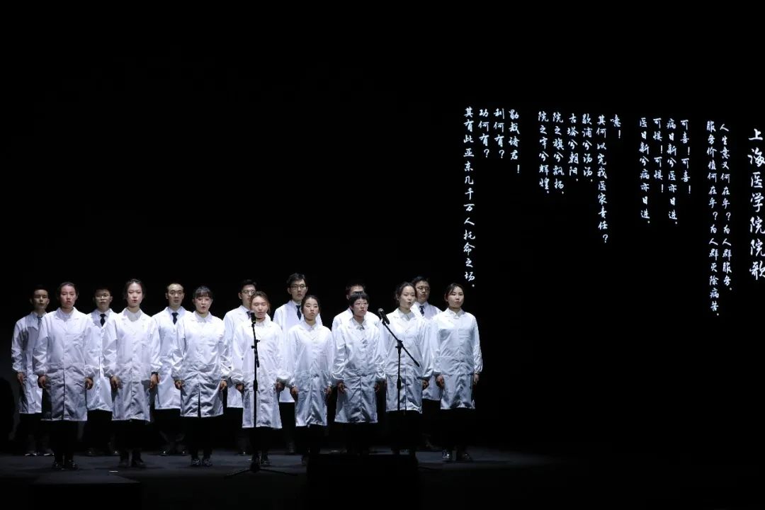 值得一提的是,为配合大师剧的公演,筹备组特意为院歌重新编曲并制作MV。此版院歌MV邀请上海克卿合唱团的40余名成员,分四个声部,共同演绎这首饱含上医情怀的动人乐章。新版院歌也在大师剧开场现场演绎,曼妙歌声带观众回溯到上医初创的那个年代。
