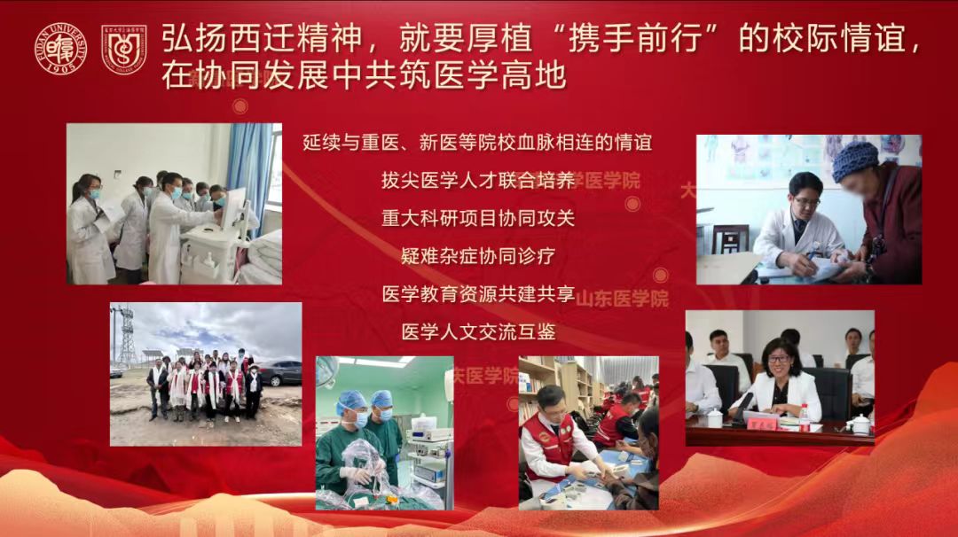 四要厚植“携手前行”情谊,以传承西迁精神为纽带,延续上医与重医、新医等兄弟院校之间血脉相连、休戚与共的深情厚谊,深化校际拔尖医学人才培养、重大科研项目攻关、疑难杂症协同诊疗、医学教育资源共建共享、医学人文交流互鉴等领域合作,助力区域协调发展。