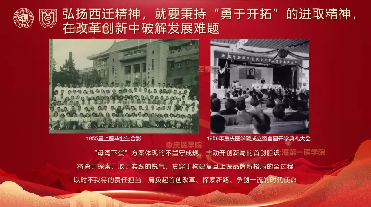 “上医西迁不仅孕育了重医,更重塑了西部医学教育发展格局。”袁军在致辞中表示,上医前辈响应国家号召远赴重庆、扎根西部,为重医建设发展奠定坚实根基,西迁精神早已融入重医精神血脉。70年来,重医始终以行动诠释西迁精神的时代内涵,发起“再向西迁”工程,将优质医疗教育资源持续延伸至西部偏远地区,续写服务国家、造福民生的初心使命。