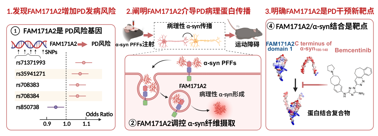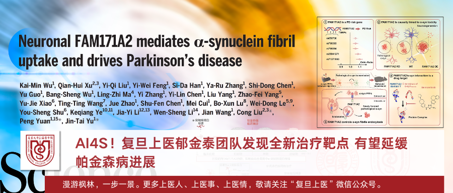 郁金泰团队结合临床数据和基础实验,发现了此前未知功能基因FAM171A2可作为这一关键受体。他们还精确鉴定了FAM171A2与病理性α-突触核蛋白相互作用的界面,并利用人工智能技术筛选到了能起到抑制作用的小分子。在体外和体内模型中,均可有效抑制毒性蛋白在神经元间的传播。这些发现表明,FAM171A2可能是首个阻断帕金森病进程的治疗靶点。