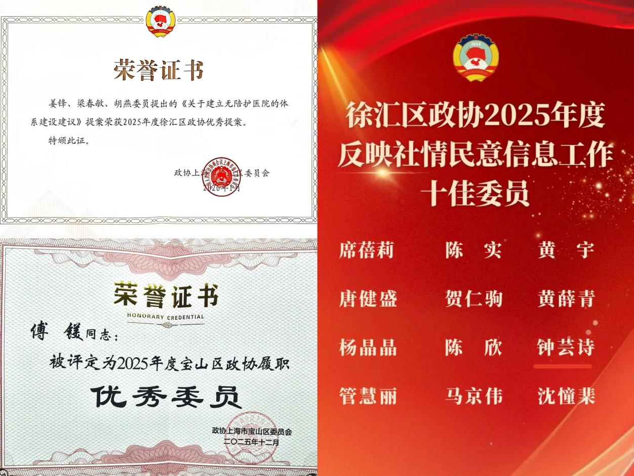 多位复旦上医政协委员凭借过往扎实的履职表现斩获荣誉。徐汇区政协常委、基础医学院梁春敏参与的提案《关于建立无陪护医院的体系建设建议》荣获2025年度徐汇区政协优秀提案;徐汇区政协常委、中山医院钟芸诗获评2025年度徐汇区政协反映社情民意信息工作十佳委员;宝山区政协常委、肿瘤医院傅镁获评2025年度宝山区政协履职优秀委员。