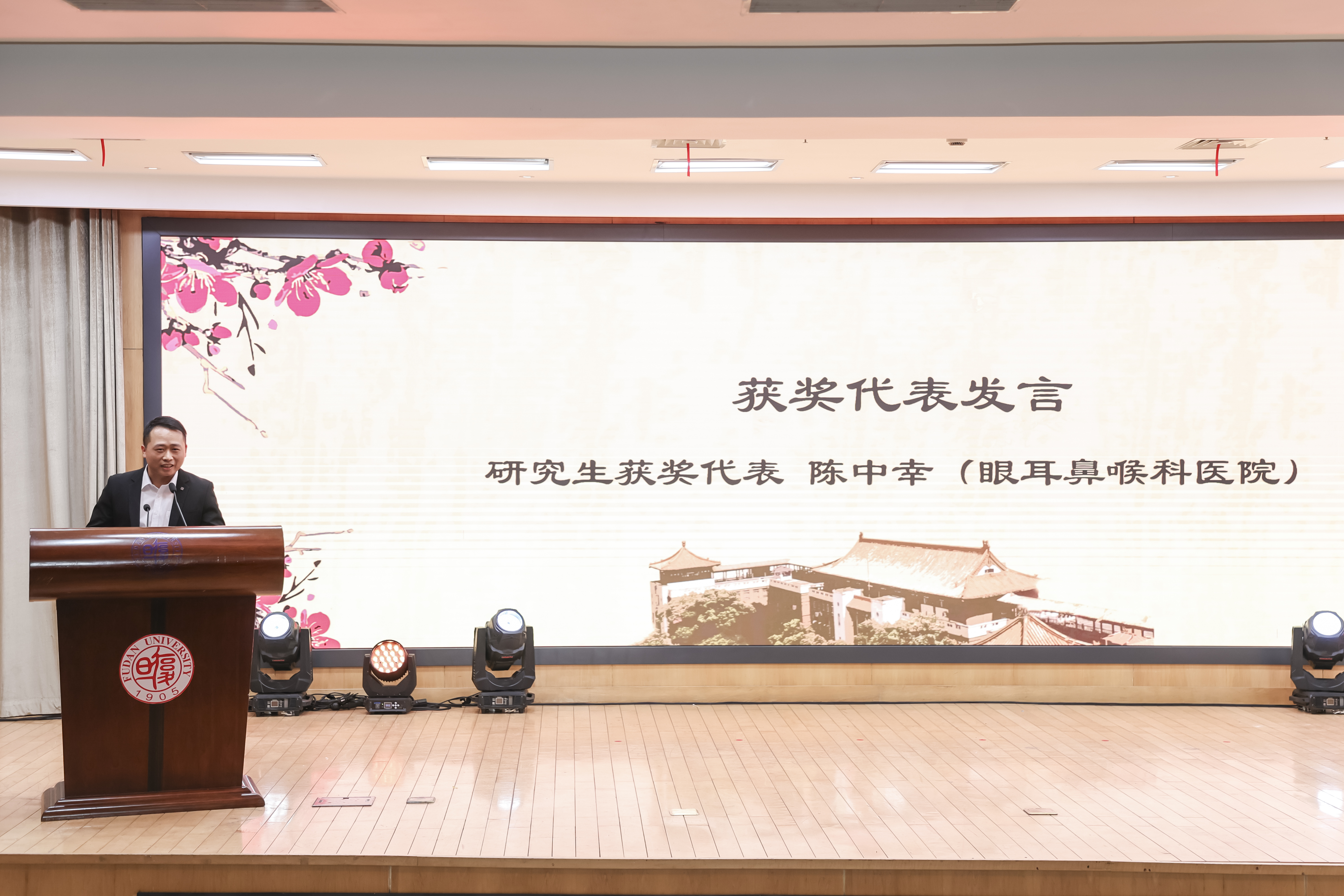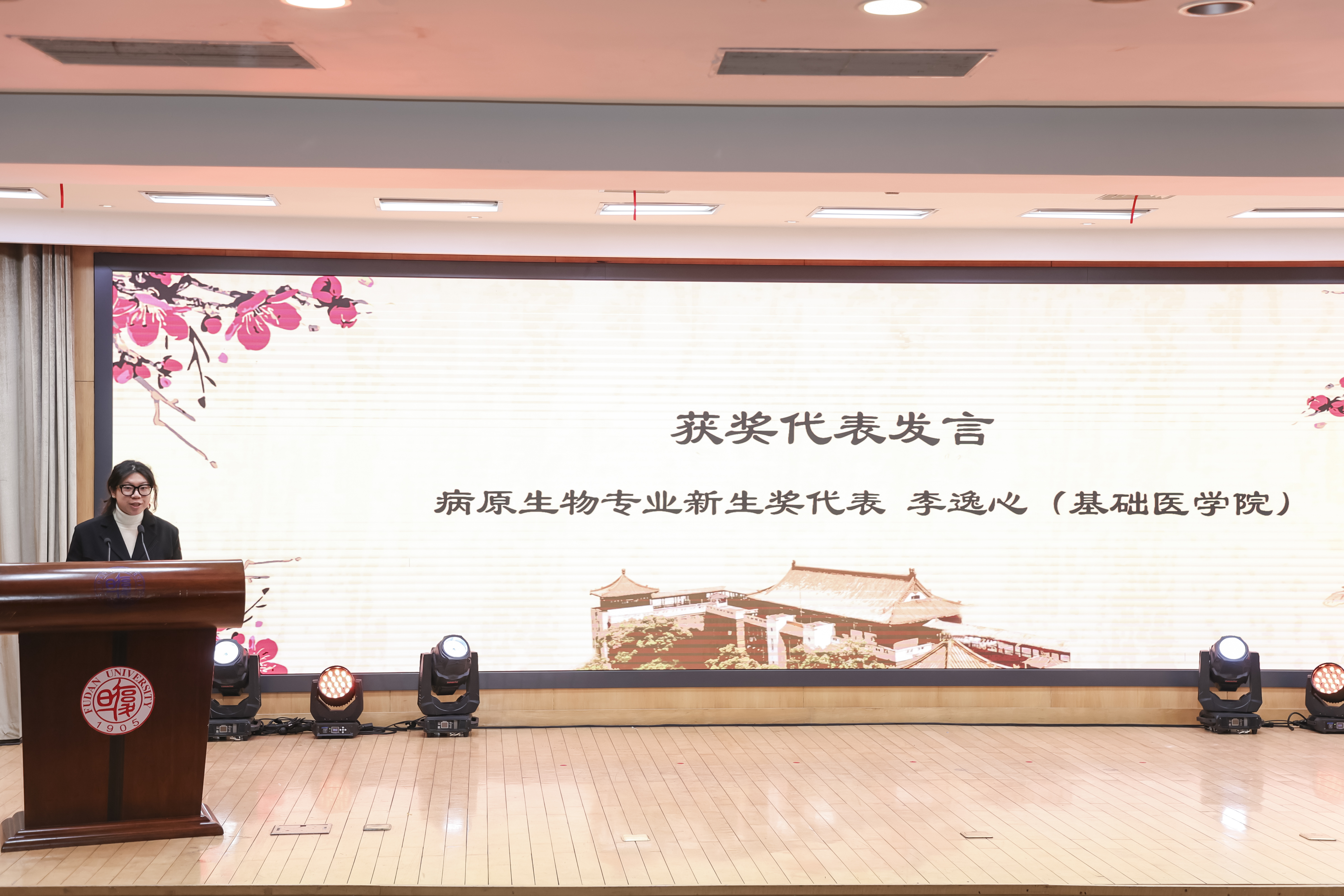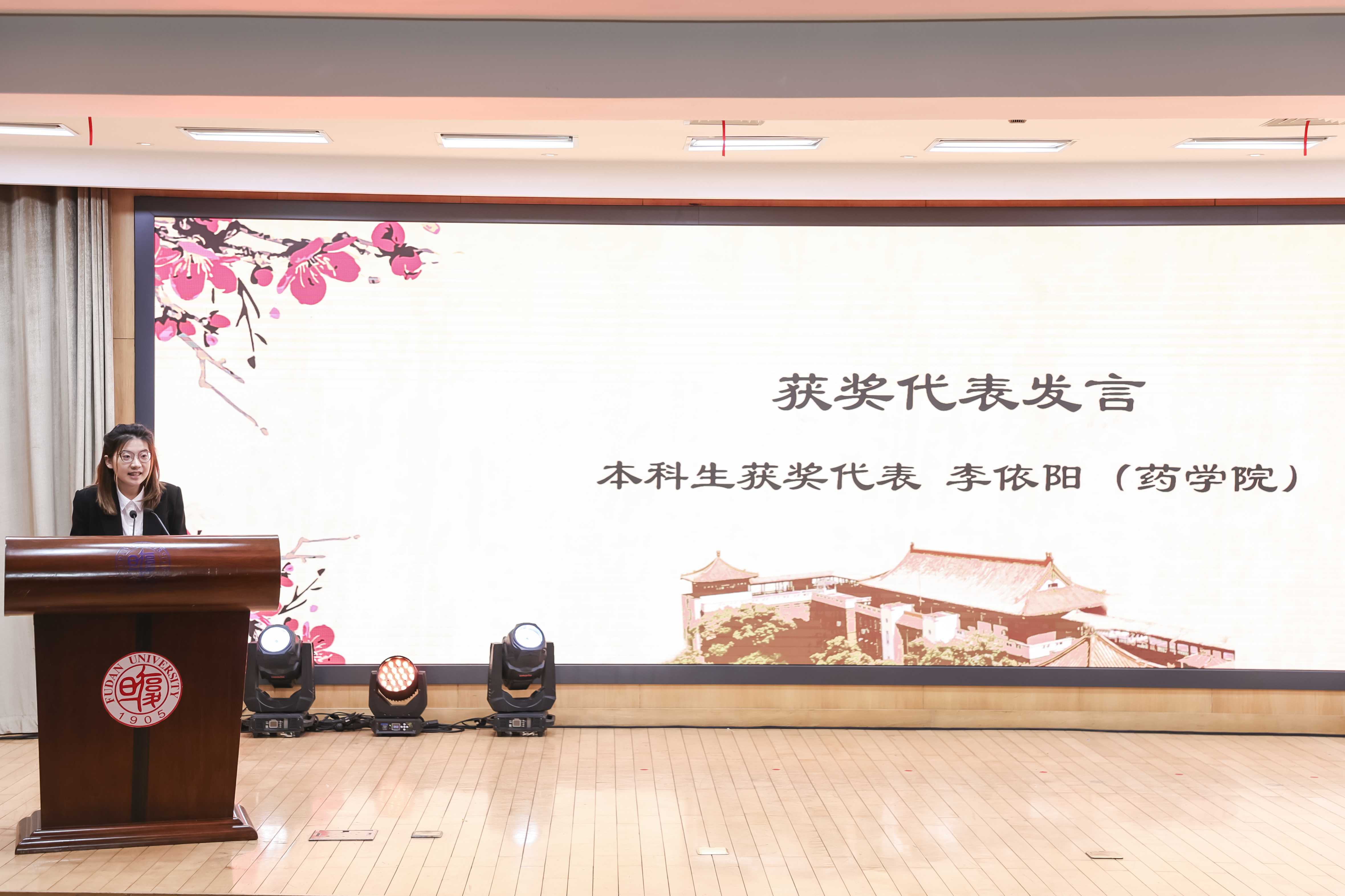“这份荣誉让我更加坚信,药学创新往往诞生于学科交叉的边界,源于从病床到实验室、再到社会的完整链条。”本科生获奖代表、药学院李依阳在发言中分享了从临床志愿服务中萌发科研灵感,研发肾衰竭靶向治疗体系并深入乡村开展用药科普的实践经历。研究生获奖代表、眼耳鼻喉科医院陈中幸以“感激、感悟、感召”为脉络,讲述了自己从临床转向科研,聚焦眼科递药难题并致力成果转化的探索之路。病原生物专业新生获奖代表李逸心从基础医学研究生的角度,分享了她受闻玉梅院士感召、选择投身病原微生物研究的初心和决心。