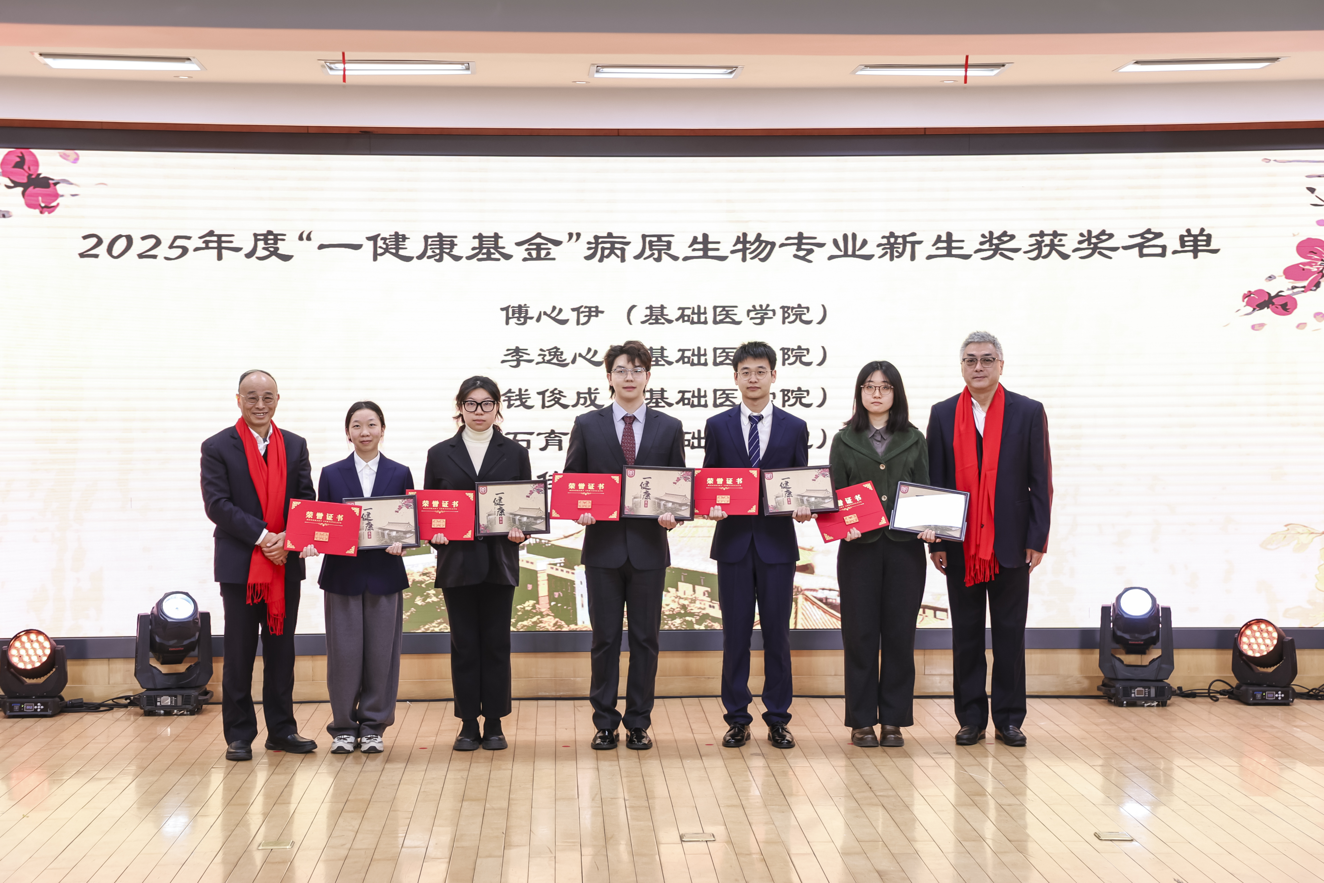 复旦大学上海医学院党委副书记、纪委书记胡华忠,复旦大学上海医学院院董、上医校友会副会长龚朝晖颁发2025年度“一健康基金”病原生物专业新生奖